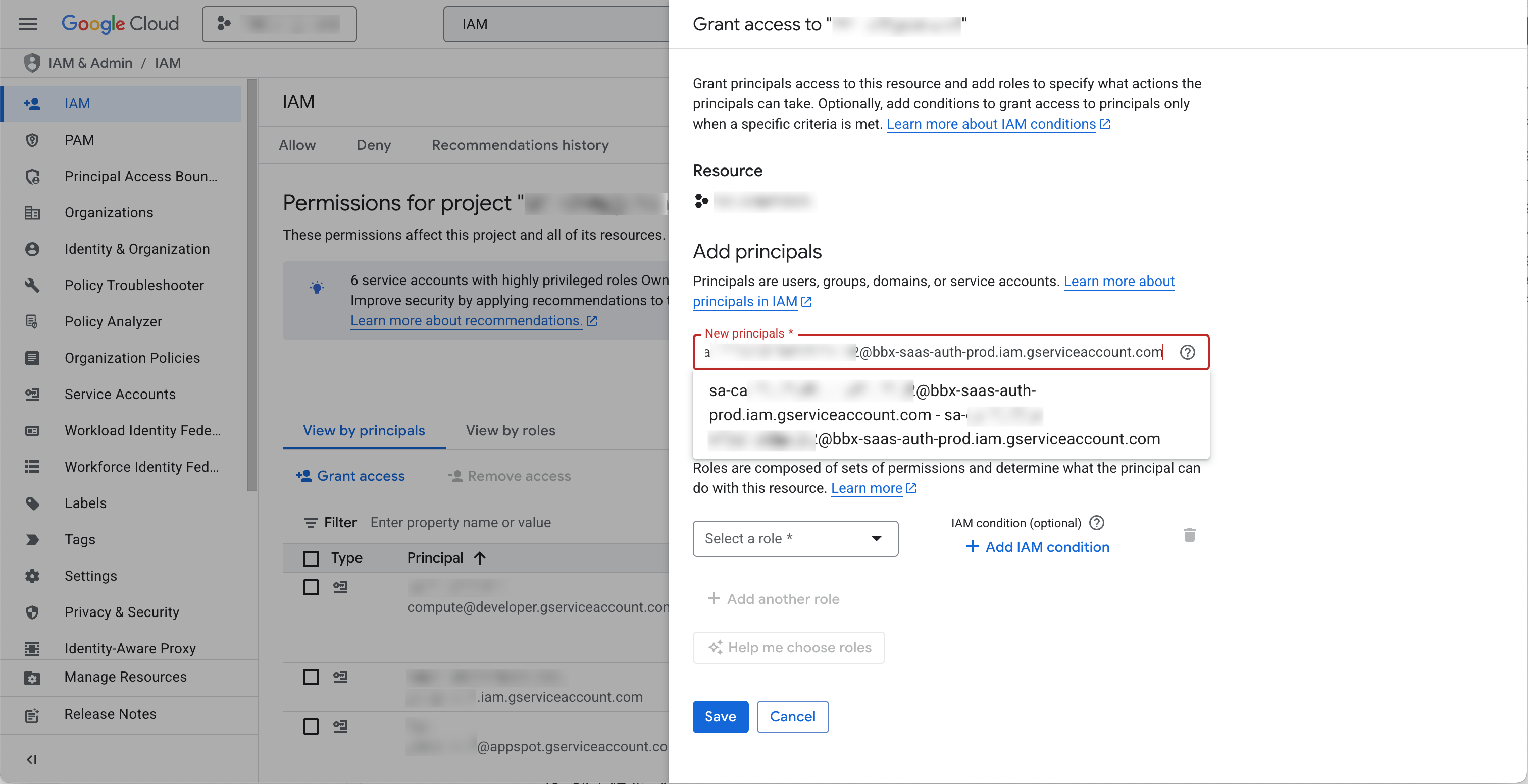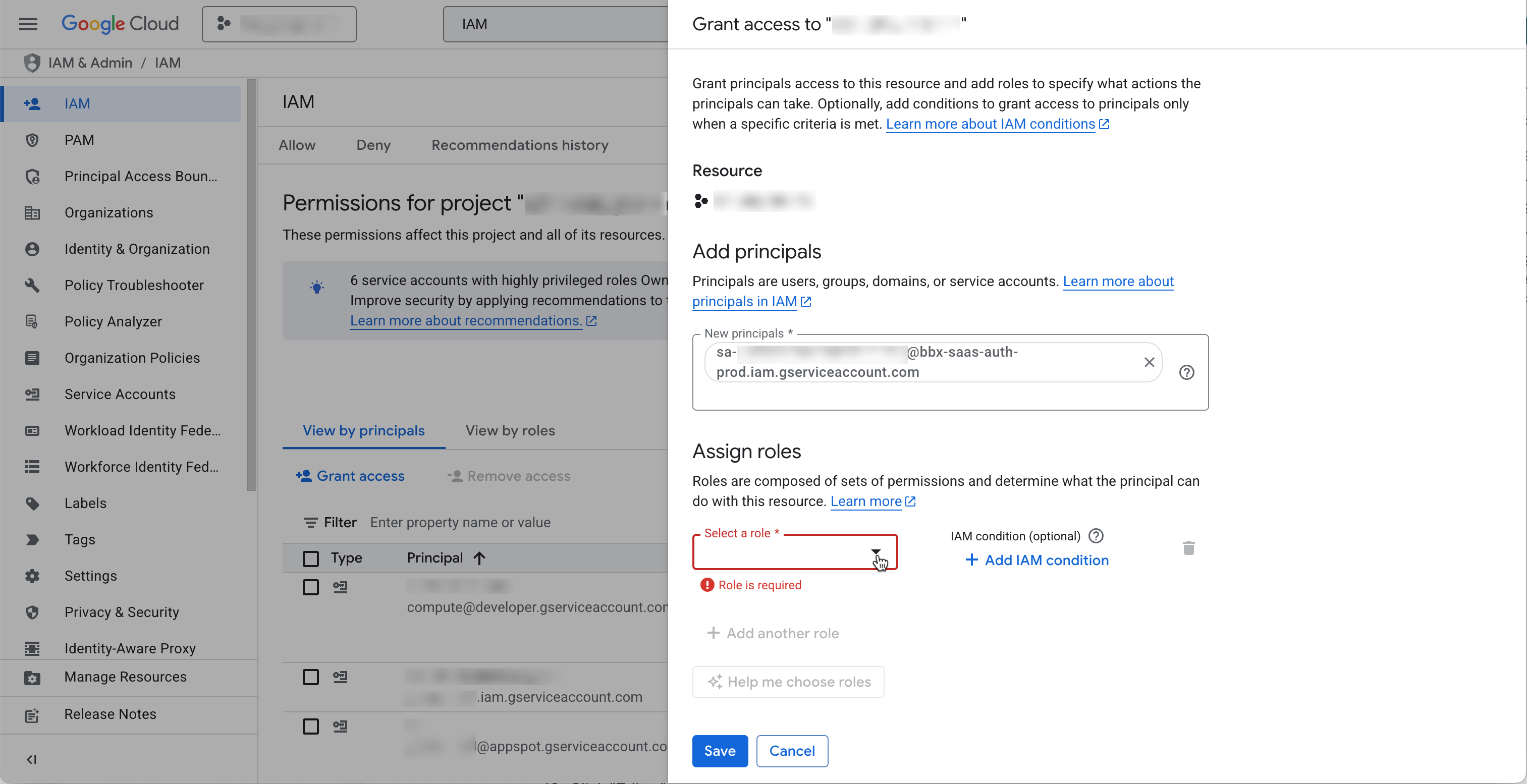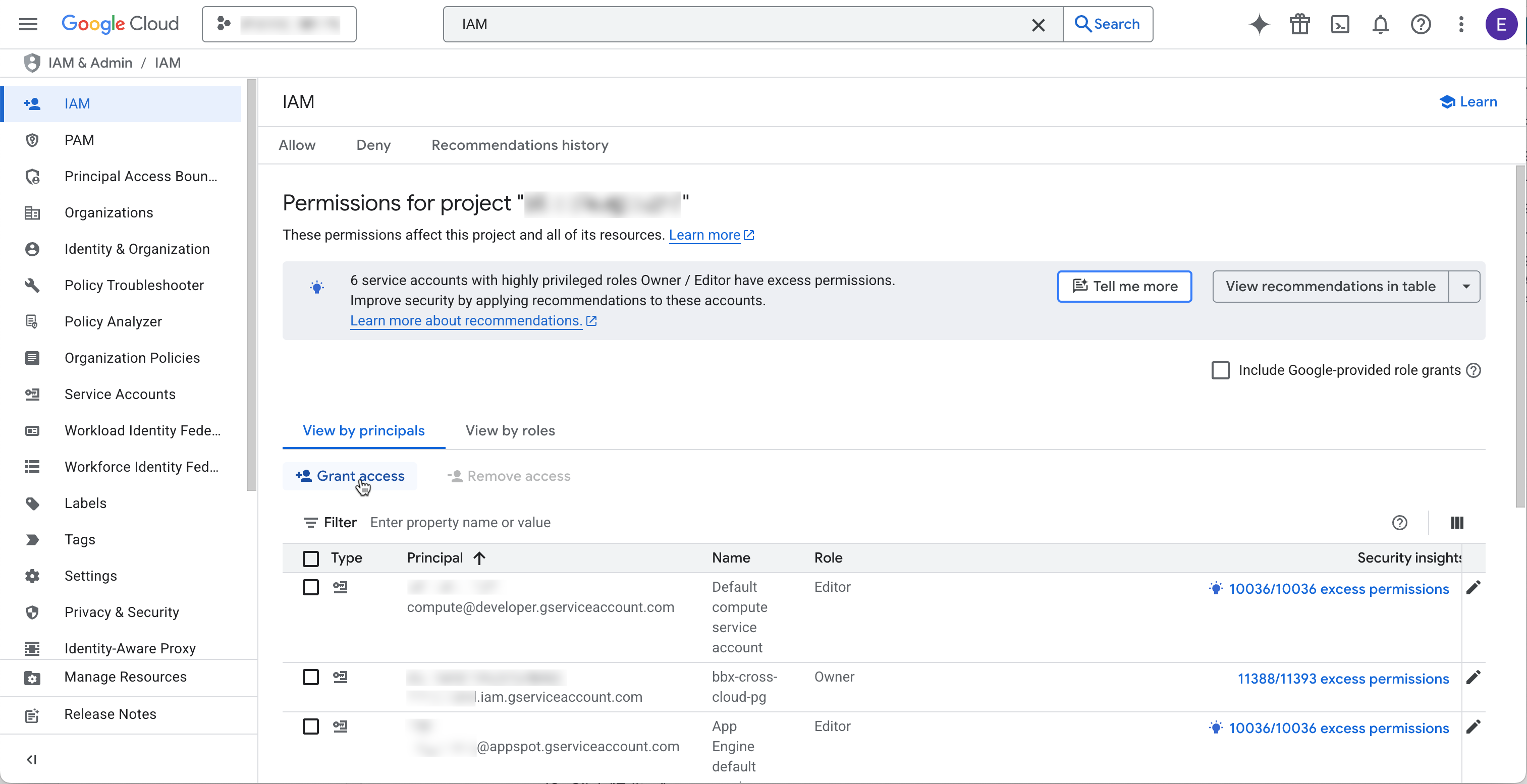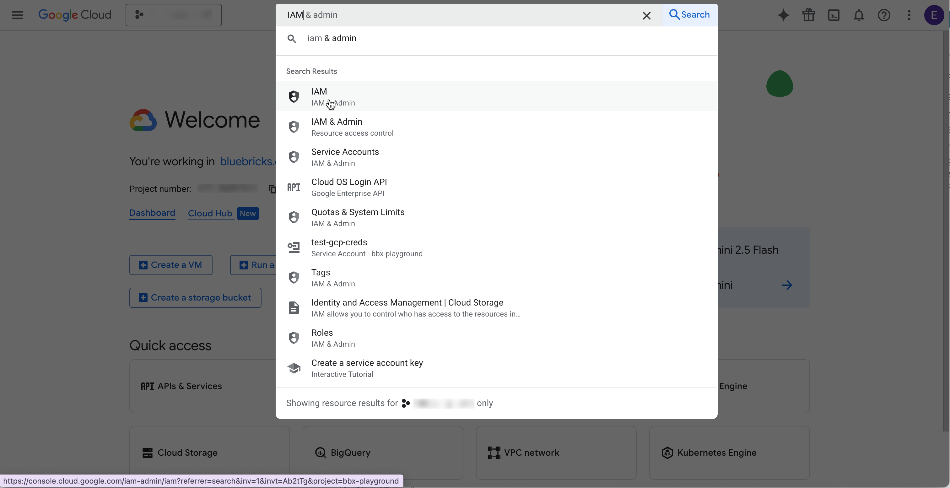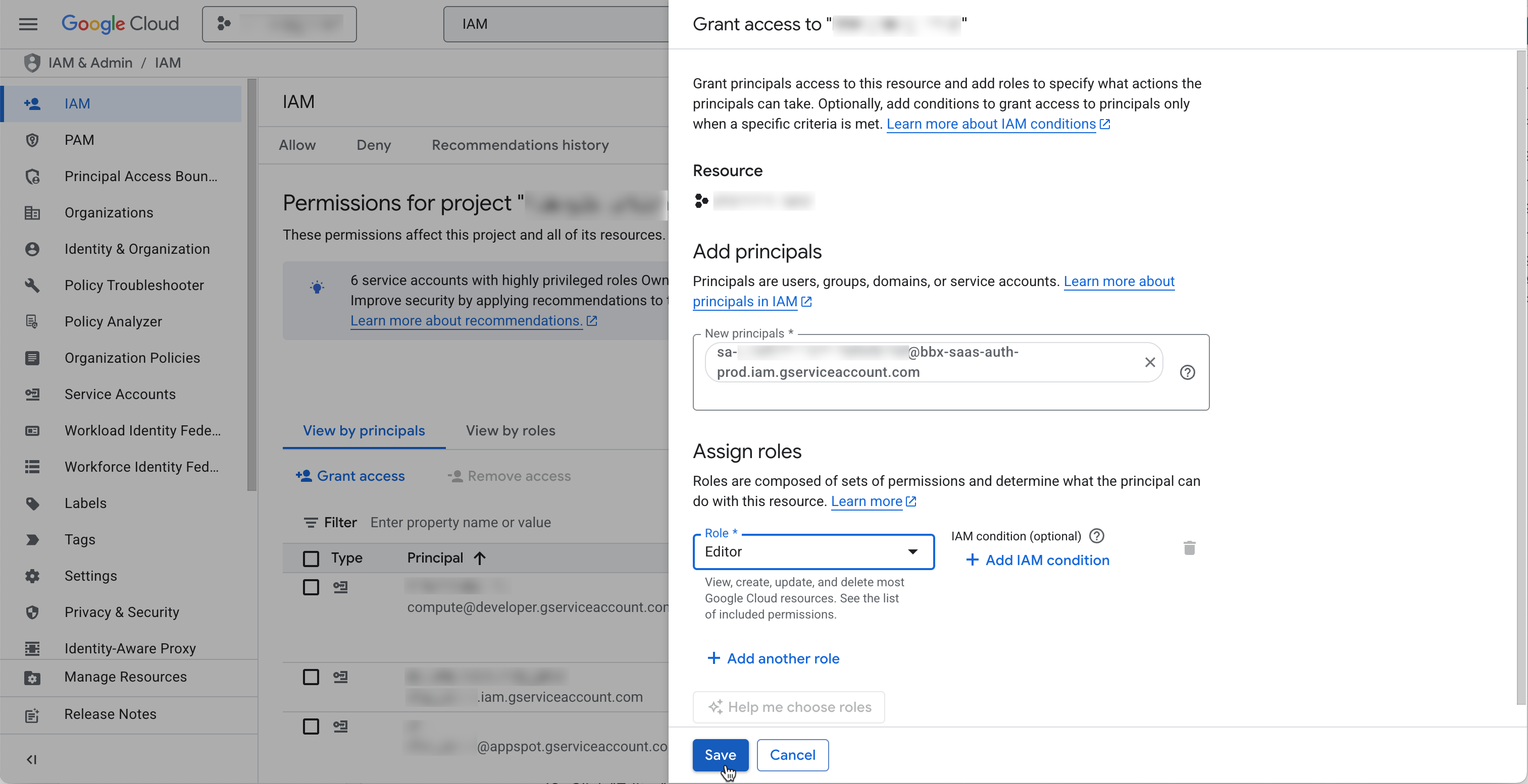 Bluebricks **also recommends** assigning the **Editor** role to the Service Account for the project to ensure it has the required permissions to manage resources effectively.