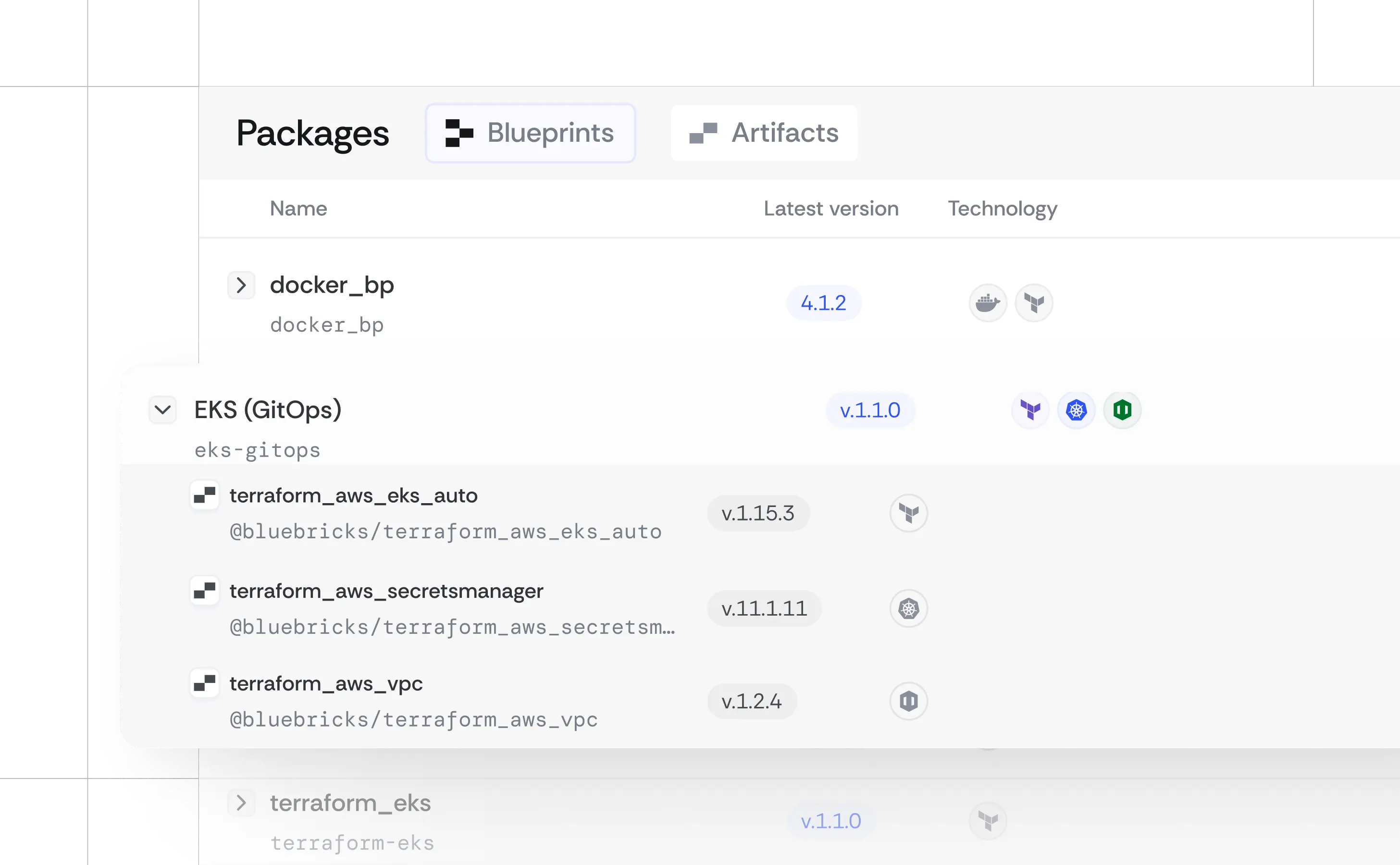 It's not just Terraform; teams use Bluebricks to orchestrate layers of infrastructure that make up the end-to-end environments your business runs on.